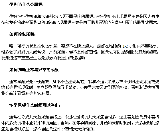 看了以上介绍您对孕妇尿频的问题有了了解吧。专家说,尿频严重影响患者正常生活,在生活中要有效的预防,适当运动,注意饮食习惯,如有身体不适,请立即去医院就诊,以免耽误病情。