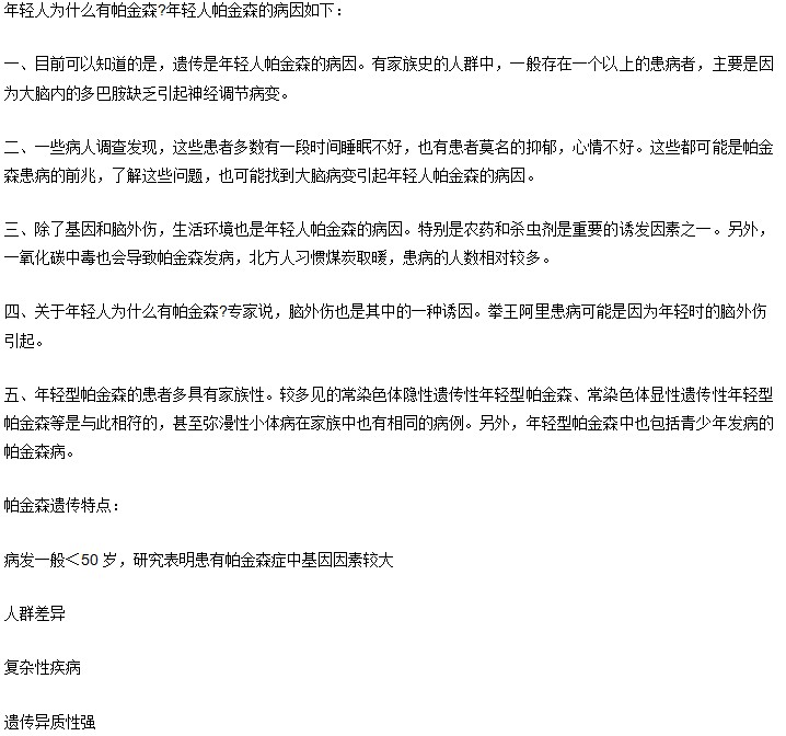 以上内容是年轻人为什么有帕金森的内容,研究表明患有帕金森症中基因因素较大人群差异复杂性疾病遗传异质性强,患者可通过就医更好的治疗。如果你想了解更多,欢迎关注医学教育网,整理会有更多的健康知识,根据您关心的健康问题,我们会网络各种资讯,为您解答。