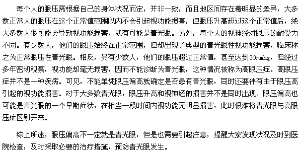 综上所述,眼压偏高不一定就是青光眼,但是也需要引起注意,提醒大家发现状况及时到医院检查,及时采取必要的治疗措施,预防青光眼发生。