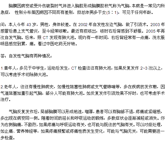 以上内容是由医学教育网小编为大家编辑整理的“气胸容易反复发作我们该怎么办”。还请大家多多关注我们医学教育网,里边会有更多更好的关于气胸的相关信息。