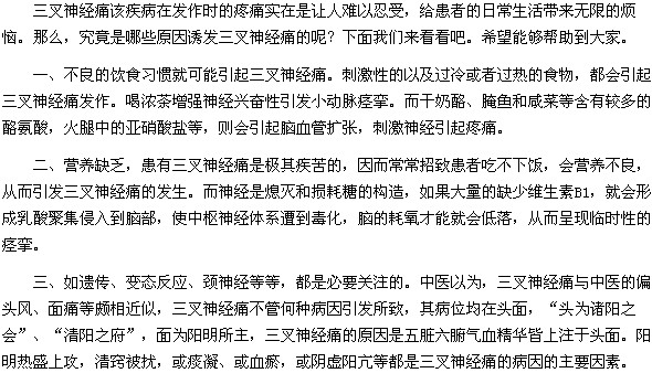 什么原因会引起三叉神经痛?引起三叉神经痛的原因是什么?相信很多人都想知道,医学教育网小编了解到不良的饮食习惯及营养缺乏都有可能引起三叉神经痛,下面就为大家详细介绍如下: