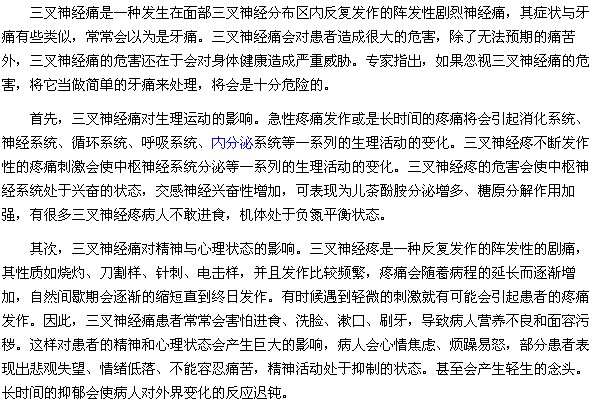 三叉神经痛引起的疼痛常常让患者难以忍受,如果只是一味地靠吃止痛药来减轻病情,那是非常不可取的。只有正视三叉神经痛的危害,积极做好预防和治疗措施,才能从根本上减轻三叉神经痛的危害。以上就是“三叉神经痛的出现对身体到底有哪些危害呢?”的内容,希望大家对三叉神经痛的危害引起足够的重视。