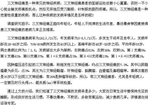 关于不良的生活饮食习惯使三叉神经痛的发病趋向年轻化的内容,相信很多人都想要了解,下面医学教育网小编特整理了“不良的生活饮食习惯使三叉神经痛的发病趋向年轻化”的内容,供大家参考,具体内容如下: