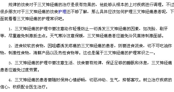 上面所讲的就是患上三叉神经痛要注意的饮食规律的内容,在了解了这些内容后朋友们在生活中要帮助患者做好日常三叉神经痛的护理工作,希望这些内容能给大家提供有效的帮助。