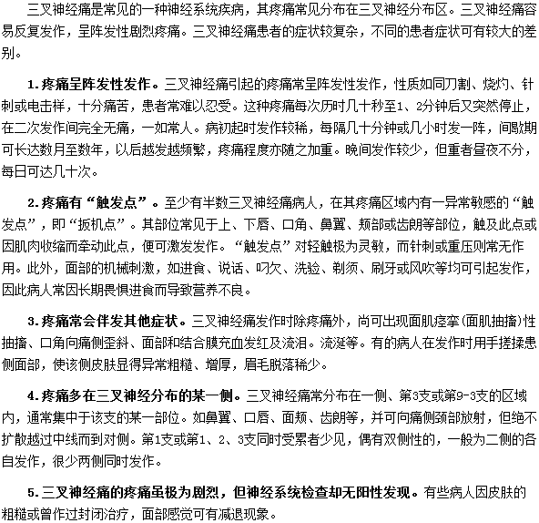 以上是三叉神经痛的五大特点的介绍。抓住了这些特点我们就能很快的将其与其他疾病鉴别开来,更快的进行治疗,以免病情加重。