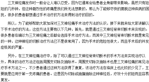 关于手术治疗三叉神经痛的方法是什么?,相信很多人都比较感兴趣,医学教育网编辑特撰文如下: