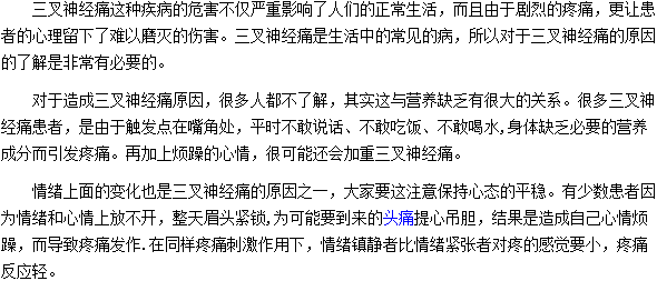 以上就是常见的三叉神经痛的原因的介绍,在日常生活中一定要多加注意,如您已经得了三叉神经痛,可以对症进行治疗。对症治疗的意思就是根据具体的患病原因以及患者所表现出来的具体症状选择出较为合适的治疗措施,这样就能够取得事半功倍的效果。
