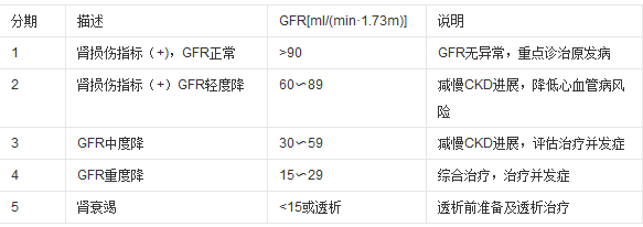 近年来,美国肾脏病基金会K/DOQI专家组对CKD的分期方法提出了新的建议,如下表所示,该分期方法将GFR≥90ml/min·1.73m且伴有肾病的患者视为1期CKD,其目的是为了加强对早期CKD的认知和早期防治。