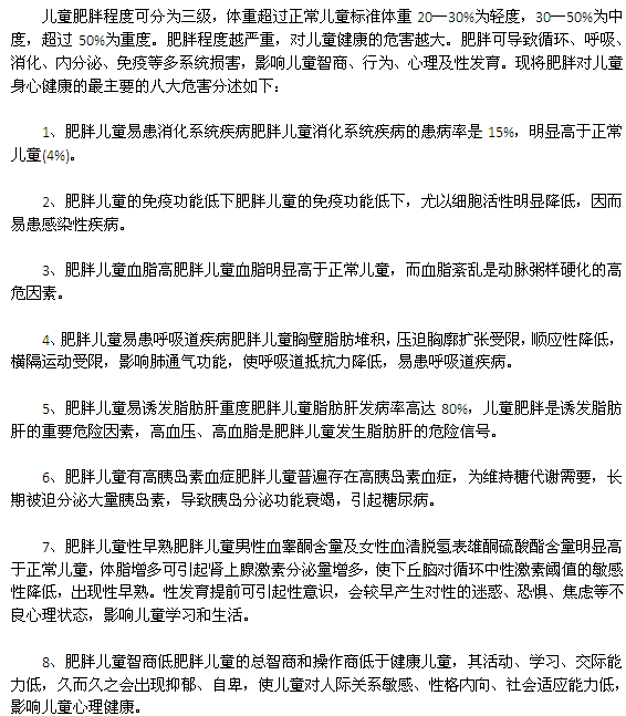 看了以上介绍您对肥胖给儿童带来什么危害有了了解吧。专家说,肥胖会影响患者正常生活,在生活中要有效的预防,多运动,注意饮食习惯,让孩子远离肥胖症。