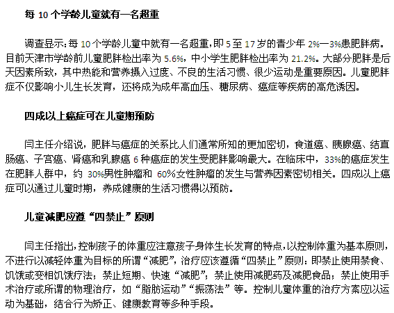 您知道吗?儿童肥胖和癌症发生几率竟然也有关系。天津儿童肿瘤科主任闫杰指出,预防癌症要从儿童抓起,尤其是控制肥胖症,可有效减少癌症发生。