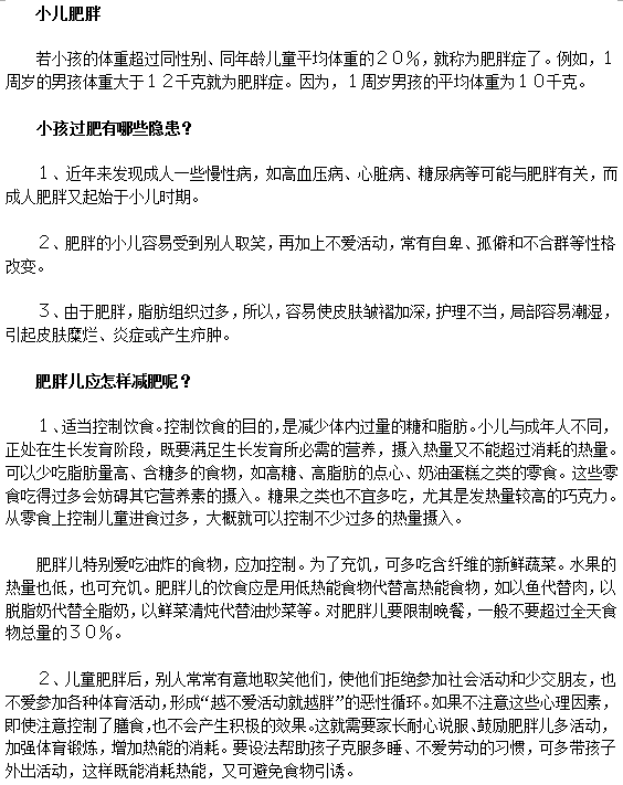 小编提醒您,孩子肥胖一定要引起注意,因为肥胖很容易引起一些其他疾病,所以各位家长一定要重视,及时预防,帮助孩子培养良好的饮食习惯。真心的希望我们的分享能够给您提供帮助,在此祝您身体健康。