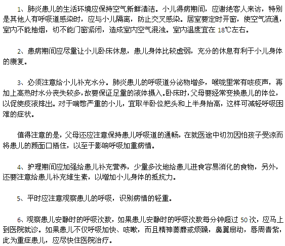 现在小儿肺炎的护理您了解了吗?小编提醒您孩子得了肺炎不要惊慌,只要使用的得当的治疗方法即可。当您了解了小儿肺炎的护理,请您务必要时刻注意孩子的情况,如果身体信号亮出了红灯,一定要听从医生的建议与指导,及时与医生沟通。真心的希望我们的分享能够为您提供帮助。在此祝您身体健康。