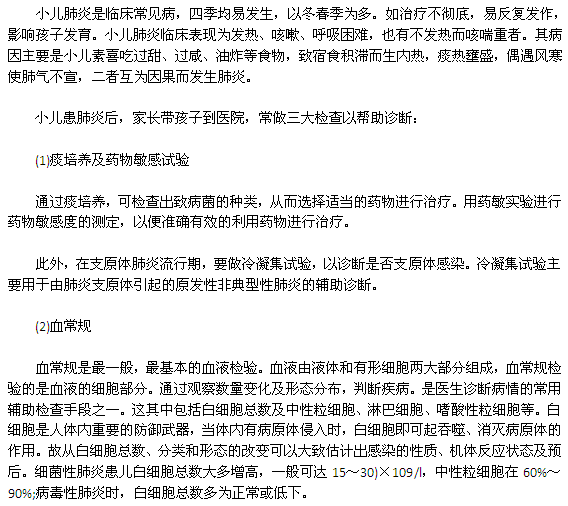 小儿肺炎很容易反复发作,所以小儿肺炎对健康的影响是很大的,如果患上小儿肺炎家长要及时带患儿到正规医院进行治疗,那么小儿肺炎都要做哪些检查呢?本文我们就给大家介绍小儿肺炎的3项常规检查。