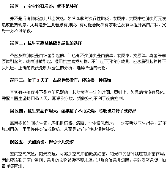 小儿肺炎是临床常见病,四季均易发生,以冬春季为多。临床表现为发热、咳嗽、呼吸困难,也有不发热而咳喘重者,如不及时治疗,可发展为重症肺炎,或者出现心力衰竭、呼吸衰竭、肺性脑病等严重危及生命的并发症。小儿肺炎如治疗不彻底,则易反复发作,影响孩子发育。但是,许多家长对小儿肺炎的认识存在误区,最常见的是以下五种: