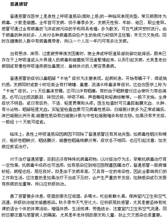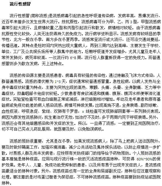 以上介绍了普通感冒和流行性感冒这两种病的主要区别、治疗与预防,这是两种在冬季常见的疾病,前者病情较平和,但多发,后者则较凶险,有时会发生流行。当然也不要过分紧张,草木皆兵,只要掌握一定的医疗保健知识,自然就会提高自己的健康水平。