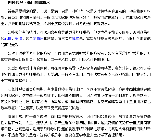 通过上述内容的讲述,相信家长们已经对小儿咳嗽在哪四种情况下可以选用咳嗽药水的内容了解了,当宝宝发生咳嗽时,应及时带宝宝去医院检查,在医生的指导下服用药物,这样就可以保证宝宝的健康不受影响了。