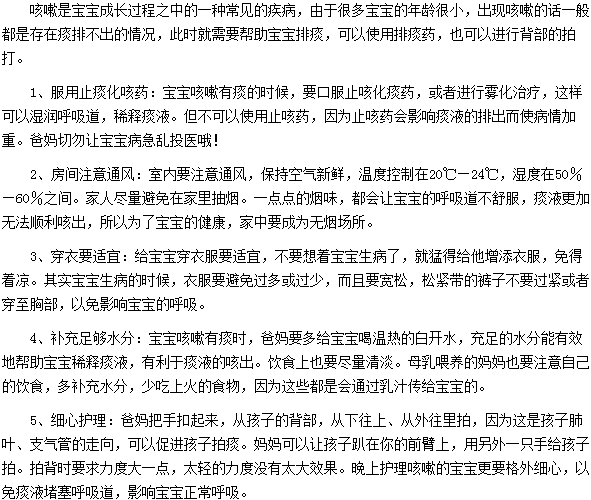 如果你的宝宝咳嗽的时候有痰排不出,就需要按照以上小编介绍的方法进行排痰及护理,而且要注意家里的通风换气工作,当然饮食上不要让宝宝吃上火的食物,多吃清淡的火气小的食物。
