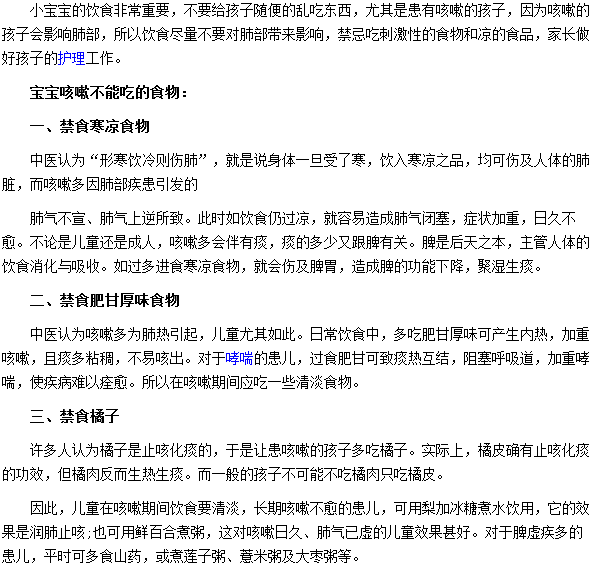 通过小编的介绍,家长朋友们对小儿咳嗽时不宜吃的食物已经有所了解,医学教育网小编提醒大家,如果宝宝长时间咳嗽就需要到正规的医院接受治疗,不然可能引起其它的疾病,影响孩子的身体健康。