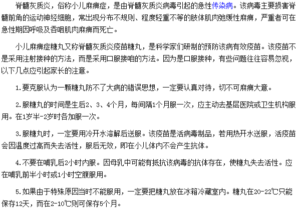 以上就是小编为您整理的有关服用小儿麻痹症糖丸应注意什么的文章,相信大家在经过对上文的阅读后应该对于服用小儿麻痹症糖丸应注意什么有了一定的了解,希望可以对大家有帮助。
