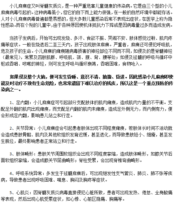 我们都知道孩子的抵抗力不如大人的强,所以很多病毒也在危害着她们的身体健康,那么我们怎么样去保护她们的健康成长呢,因为每一个宝宝都是父母的天使,只是有的天使折断了翅膀来到了我们的身边,正因为他们受伤了,才需要我们更多的保护和爱!日常生活中越来越多的儿童受到了小儿麻痹症的危害。那么,小儿麻痹症会给患者带来哪些危害?请跟随医学教育网一起来看一下相关的内容。