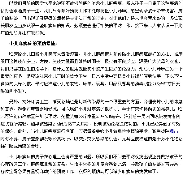以上能够有效预防小儿麻痹症的措施的内容就为大家介绍完了,在看完上述介绍后相信大家对能够有效预防小儿麻痹症的措施已经了解了,小儿麻痹症一定要做好预防措施,给宝宝一个健康的身体。