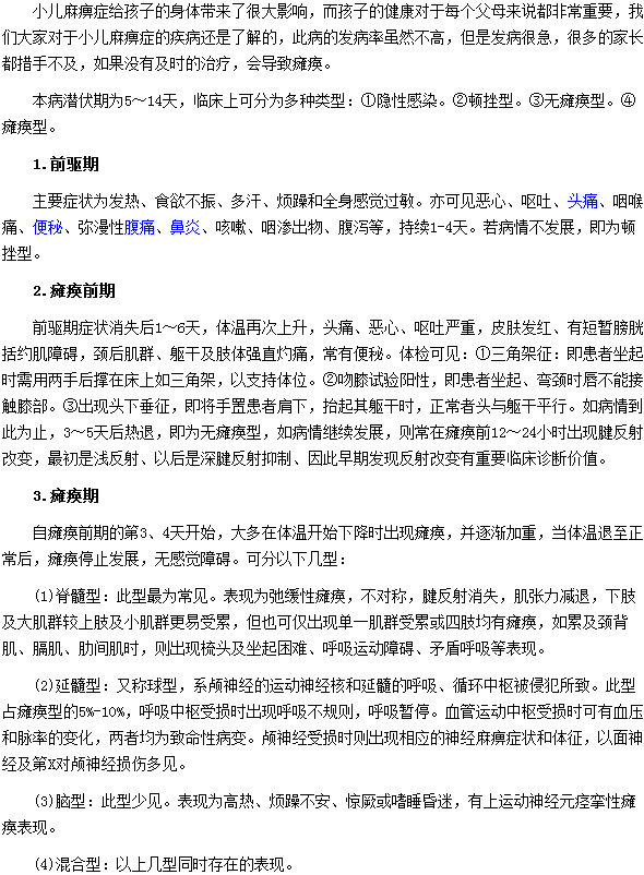 相信有不少朋友都想了解小儿麻痹症对孩子身体的影响有哪些?下面医学教育网小编就为大家整理了小儿麻痹症对孩子身体的影响的相关文章,供大家参考。