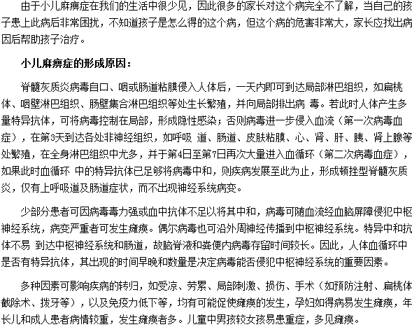 关于小儿麻痹症的形成原因及带来的危害的文章,相信很多人都比较感兴趣,医学教育网编辑为帮助大家了解相关知识,特整理小儿麻痹症的形成原因及带来的危害的具体内容如下: