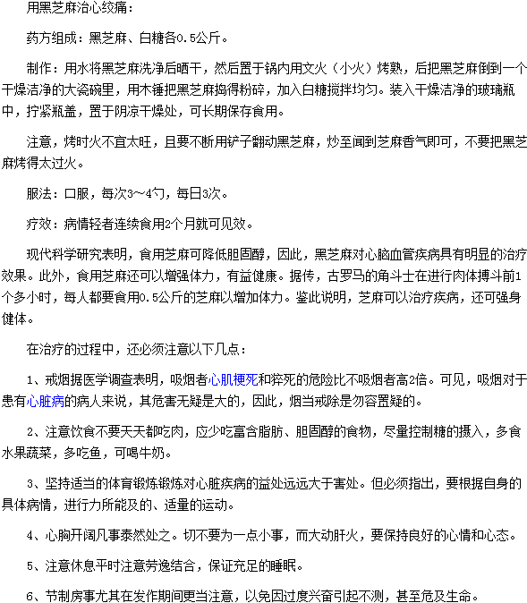 关于用黑芝麻治心绞痛及治疗心绞痛的注意事项,很多人都想知道,医学教育网编辑经过多方搜寻,现将用黑芝麻治心绞痛及治疗心绞痛的注意事项的内容分享给大家,希望对大家有所帮助。