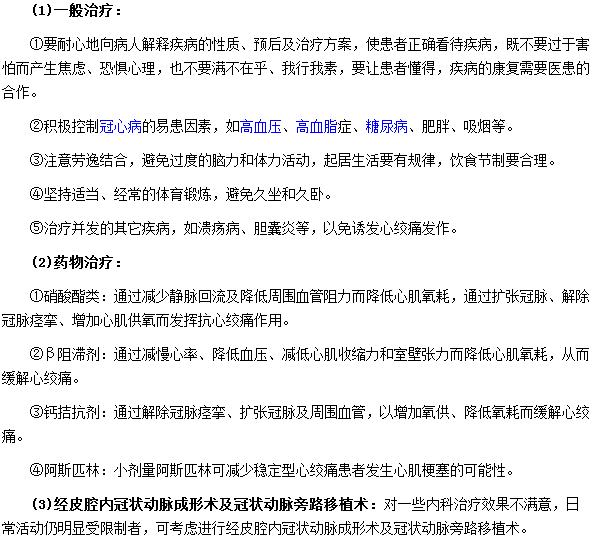 心绞痛的治疗分为发作时的治疗和缓解期的治疗,这里主要谈稳定型心绞痛缓解期的治疗原则,即改善冠状动脉的供血和降低心肌的氧耗,同时也治疗动脉粥样硬化,其治疗原则具体分述如下: