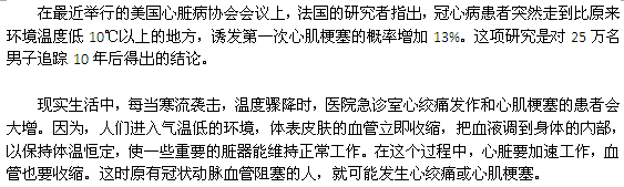 您知道吗?温差大于10℃容易引发心肌梗塞,想知道这是怎么一回事吗?相信您看了这篇有关心肌梗塞的文章,您就了解了。