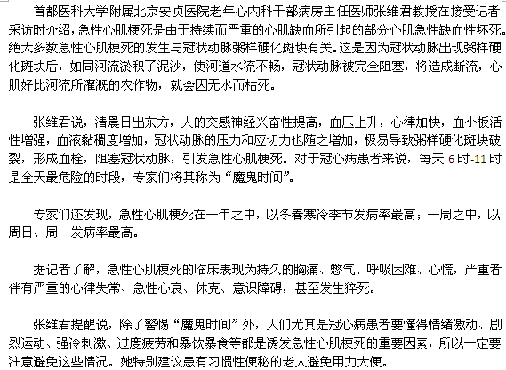 人体的生物代谢与自然界的变化息息相关,专家们通过观察发现,一些疾病的发生有着比较明显的时间规律,比如要防范急性心肌梗死,千万不能忽视最易发生急性心肌梗死的“魔鬼时间”。