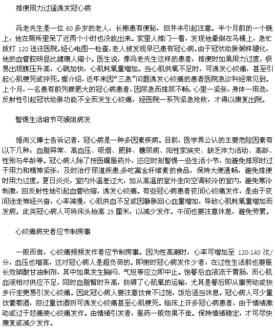 小编提醒说,冠心病人在生活中如果学会自我防护,可有效延缓或阻止冠心病的发生。比如下面这三件事冠心病人就一定要注意: