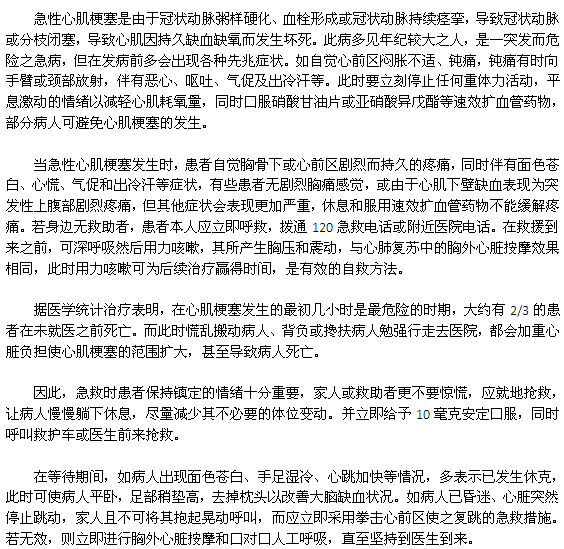以上介绍了关于心肌梗塞的一些紧急处理,希望患者多加注意,相信朋友们通过对以上这些内容的阅读,对于这个疾病心肌梗塞有了更加深一步的了解和认识了吧,希望这些内容能够给心肌梗塞的患者朋友们带来一些有用的帮助。