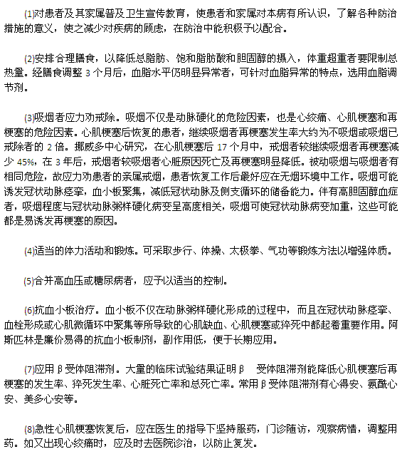 近20年来,由于加强监护和治疗水平的提高,急性心肌梗塞住院病死率明显降低,从30%左右降至10%以下。但再梗塞或多次梗塞的患者增多,成为心肌梗塞后死亡的主要原因之一。因此除在急性期应积极治疗外,还应加强心肌梗塞后的康复和二级预防,以延长患者寿命,提高生活质量和恢复工作能力。心肌梗塞后的积极预防包括: