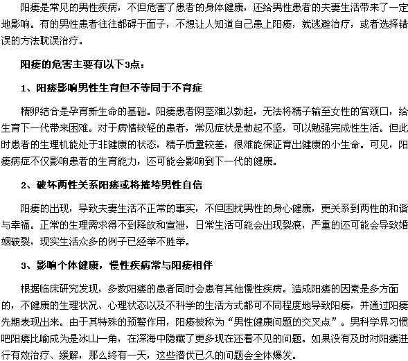 以上就是“阳痿影响男性生育但不等同于不育症”的相关内容,小编提醒广大男性朋友们阳痿患者不要以为面子就不治疗,必须要积极地及时去治疗。