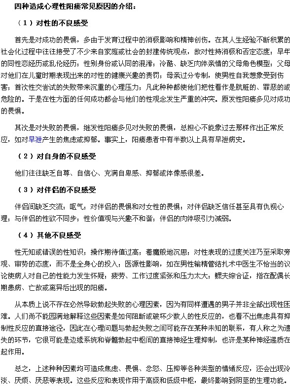 以上四种造成心理性阳痿常见原因的内容就为大家介绍完了,对于造成心理性阳痿常见原因相信大家已经有所了解,大多数心理性阳痿对心理和行为治疗的反应是很好的,只要不是有病乱投医和上庸医的当,其预后仍是很好的,希望对大家有所帮助!