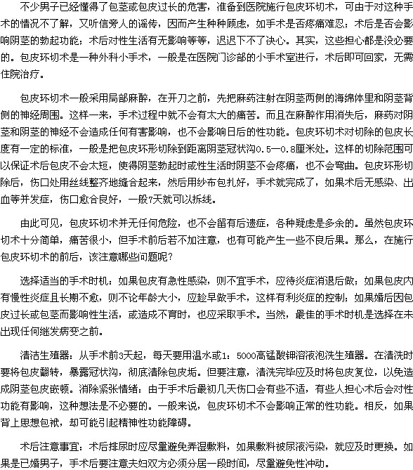 施行包皮环切术会导致阳痿的发生吗?通过小编对上述文章的介绍相信大家都了解了吧,包皮环切术是一种外科小手术,一般是在医院门诊部的小手术室进行,术后即可回家,无需住院治疗。包皮环切术并无任何危险,也不会留有后遗症,各种疑虑是多余的。