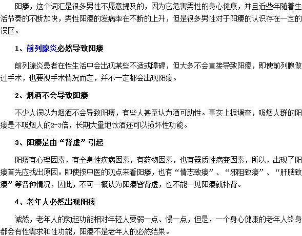 以上介绍了男人患上阳痿经常会进入的四大误区的内容,男性朋友能够很好的诊断自己的身心健康,男性朋友应该在日常生活中多关注自己的健康,多了解了一些疾病的常识,及早的预防各类疾病的出现。