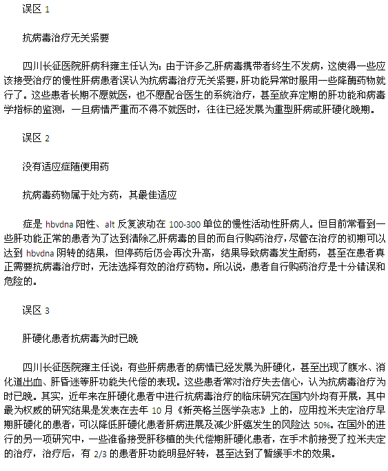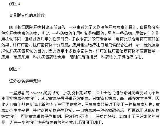 我国是肝病(h b v)感染的高发区,慢性肝病患者约3000万人,部分患者可发展为肝硬化或原发性肝癌。关于慢性肝病的治疗目标,目前国际、国内学术界已达成共识,就是长期抑制病毒复制,延缓肝病的进展。而达成上述治疗目标,抗病毒治疗是关键。但是在临床工作中,发现许多患者对抗病毒治疗有认识上的偏差,使治疗中存在种种误区。下面小编就和大家谈谈这五大误区:
