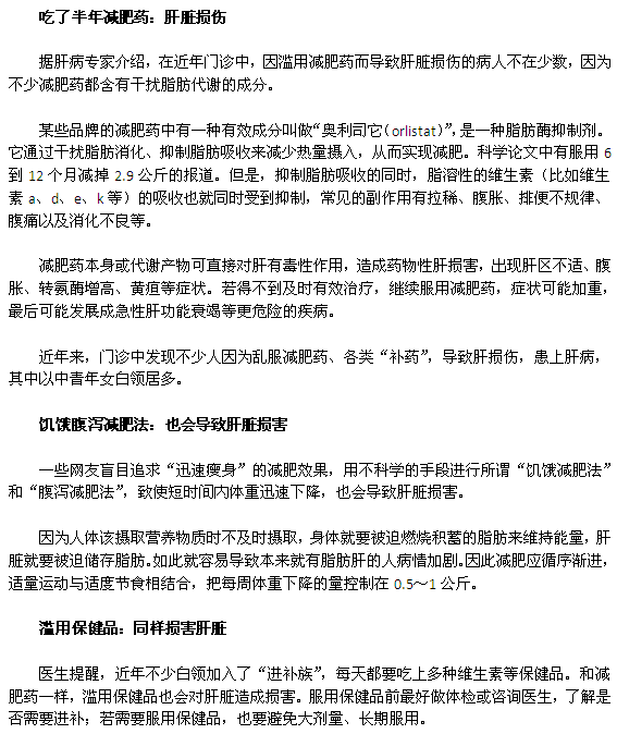 一些胖妹妹为了减肥常采用一些不科学的减肥方法,比如节食、减肥药,虽然暂时性的看到了减肥效果,殊不知减肥药有损伤肝脏的风险。所以大家还是要谨慎减肥。