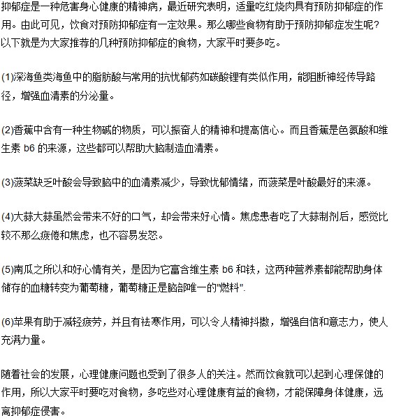 随着众多明星因为抑郁症自杀。近年来,抑郁的情况越来越收到重视,问题也越来越严重,今天我们就探讨如何预防抑郁症。医学教育网编辑特别整理了这篇关于预防抑郁症适宜吃哪些食物,希望对于心理压力大、情绪容易失控的您有帮助: