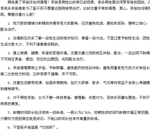 以上就是医学教育网小编对“男性患上早泄的八种调理方法解析”内容的介绍,希望能对广男性朋友有所帮助,早泄除了要积极配合医生的治疗外,还需要患者的日常调理,建立良好的生活习惯。