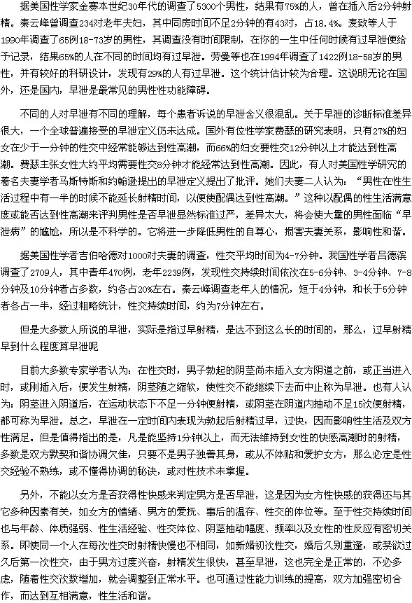 过早射精早到什么程度算早泄呢?早泄是男子性功能障碍中仅次于阳痿的最常见的症状,也是对正常性功能误解最多的一个问题。相信很多人都想知道过早射精早到什么程度算早泄呢?下面请大家仔细阅读医学教育网编辑专门为您整理的过早射精早到什么程度算早泄这篇文章吧。