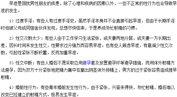 以上就是关于“会导致早泄发生的不正常性行为”的相关内容,通过对上述文章的介绍,相信大家已经有所了解,希望能够帮助到大家,更多没人请继续关注医学教育网。