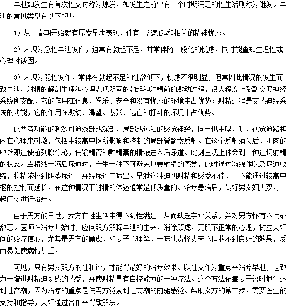 以上就是早泄常见的三种类型的相关内容,相信大家对此已经有一定了解了,希望上述文章对大家能够有帮助,更多早泄的内容请继续关注医学教育网!