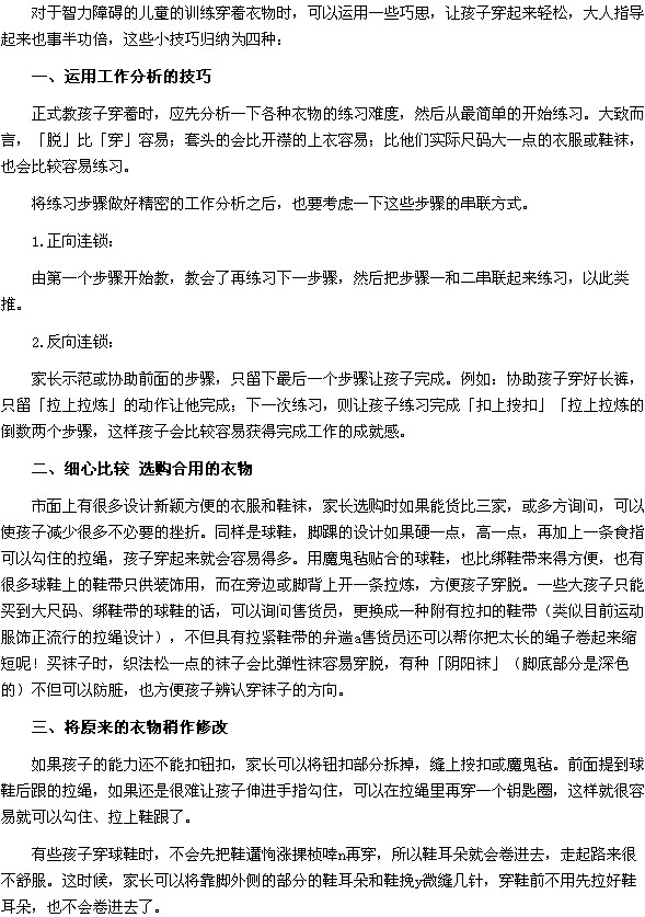 训练智力低下儿童的穿衣小技巧四种是什么?相信很多患有智力低下的儿童家长都非常想知道,为此,医学教育网小编特为大家分享“训练智力低下儿童的穿衣小技巧四种”这篇文章,望广大家长朋友仔细阅读。