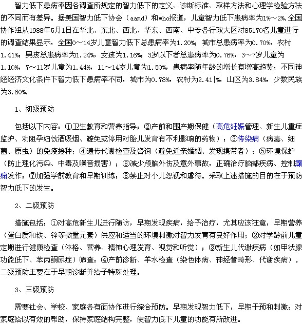 通过对上文的了解,相信广大家长朋友们已经知道了智力低下的三级预防方法是什么了,预防的根本途径是不断加深对智力低下病因学的研究,只有针对病因采取措施,才能使预防更加有效,希望上述文章对大家能够有所帮助。