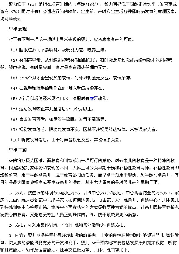 儿童智力低下的早期表现有哪些?如何对智力低下儿童进行早期干预?相信很多患有智力低下儿童的父母对此问题都很想了解,为此医学教育网小编特整理了“儿童智力低下的早期表现及早期干预”这篇文章,具体内容如下: