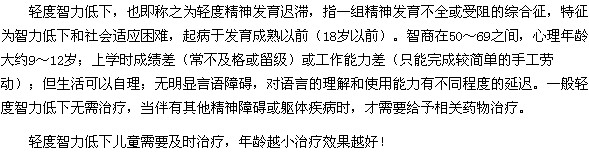 以上就是“轻度智力低下儿童长大后会有什么表现?”的内容,相信大家通过上述文章的介绍,对轻度智力低下儿童长大后的表现已经了解了,希望广大家长认真对待上述文章中提到的知识,给孩子一个健康快乐的童年。