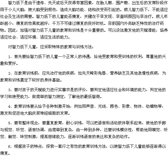 关于智力低下儿童应采取特殊教育训练法,相信很多智力低下儿童的家长都很想要了解,为方便大家查看相关内容,医学教育网编辑特整理智力低下儿童应采取特殊教育训练法这篇文章分享给大家,一起来看看吧。